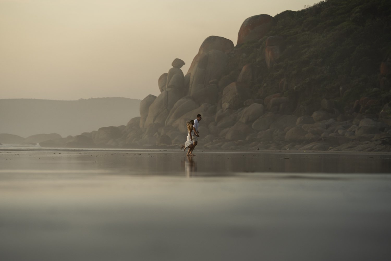 A couple walking along the shoreline near large rocky cliffs at sunrise or sunset.