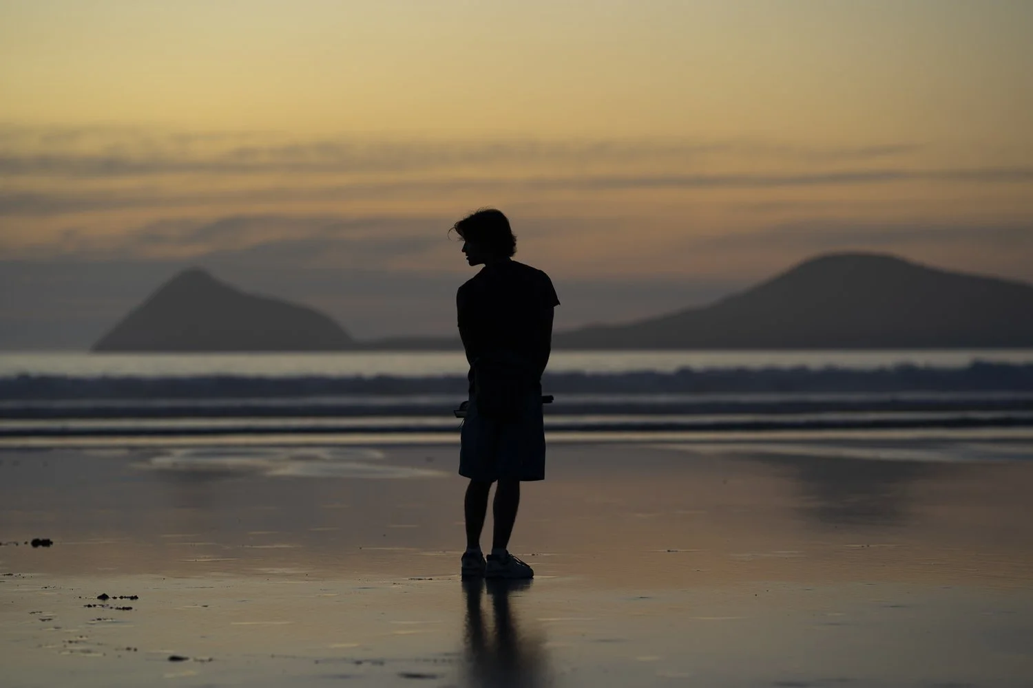 Silhouette of a person standing on the beach at sunset, with mountains in the background and a calm ocean reflecting the colors in the sky.