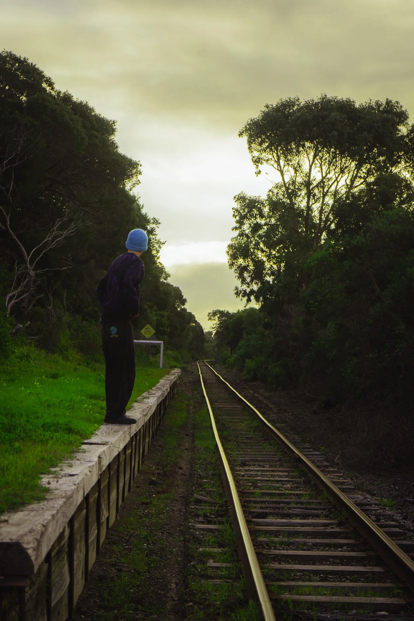A person wearing a blue hat and dark clothing standing on a narrow wooden platform beside railroad tracks, looking into a green, wooded landscape with an overcast sky.