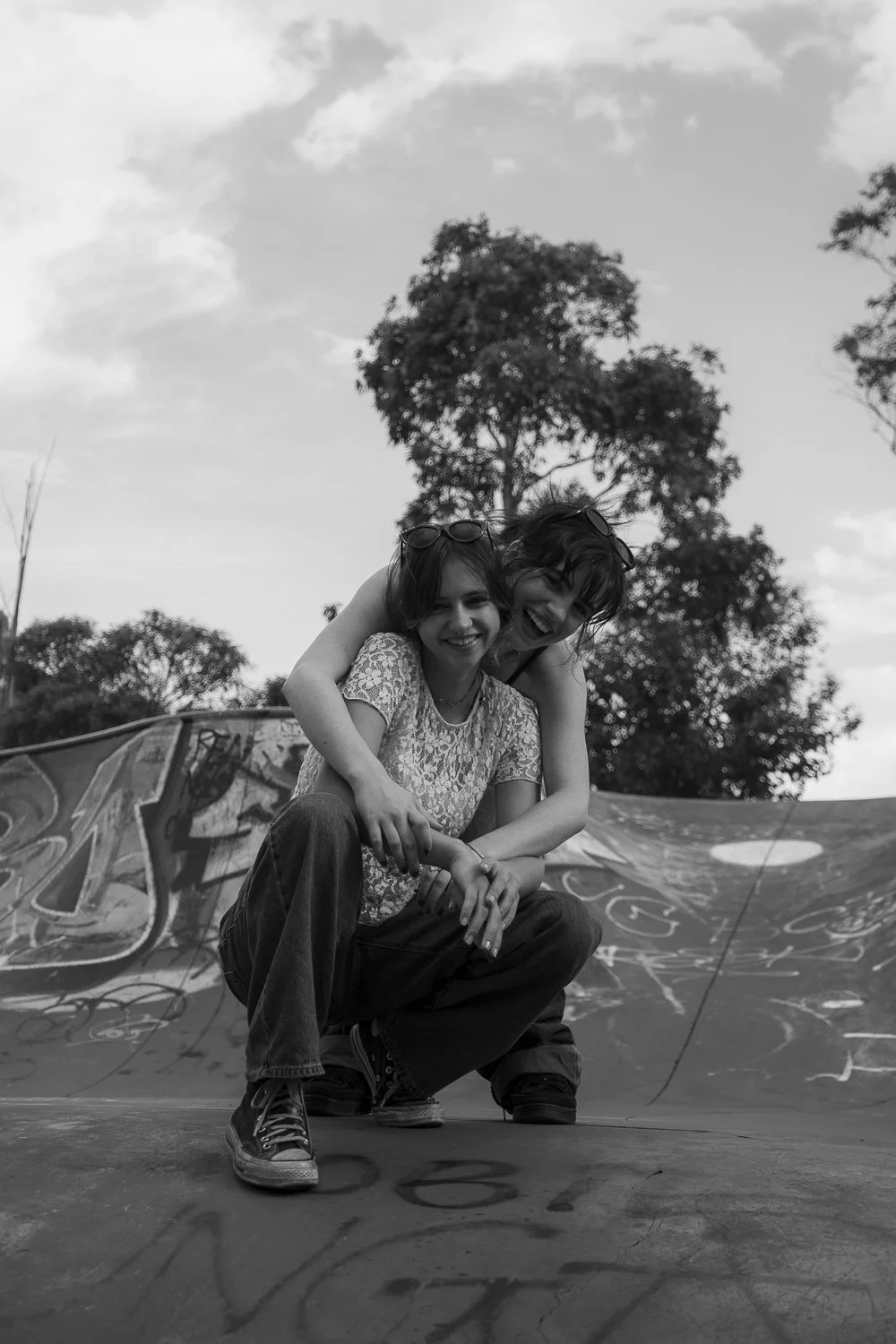 Two young women with short hair and glasses, one sitting and the other hugging her from behind, smiling at a skate park with graffiti on the ramp and trees in the background, in black and white.