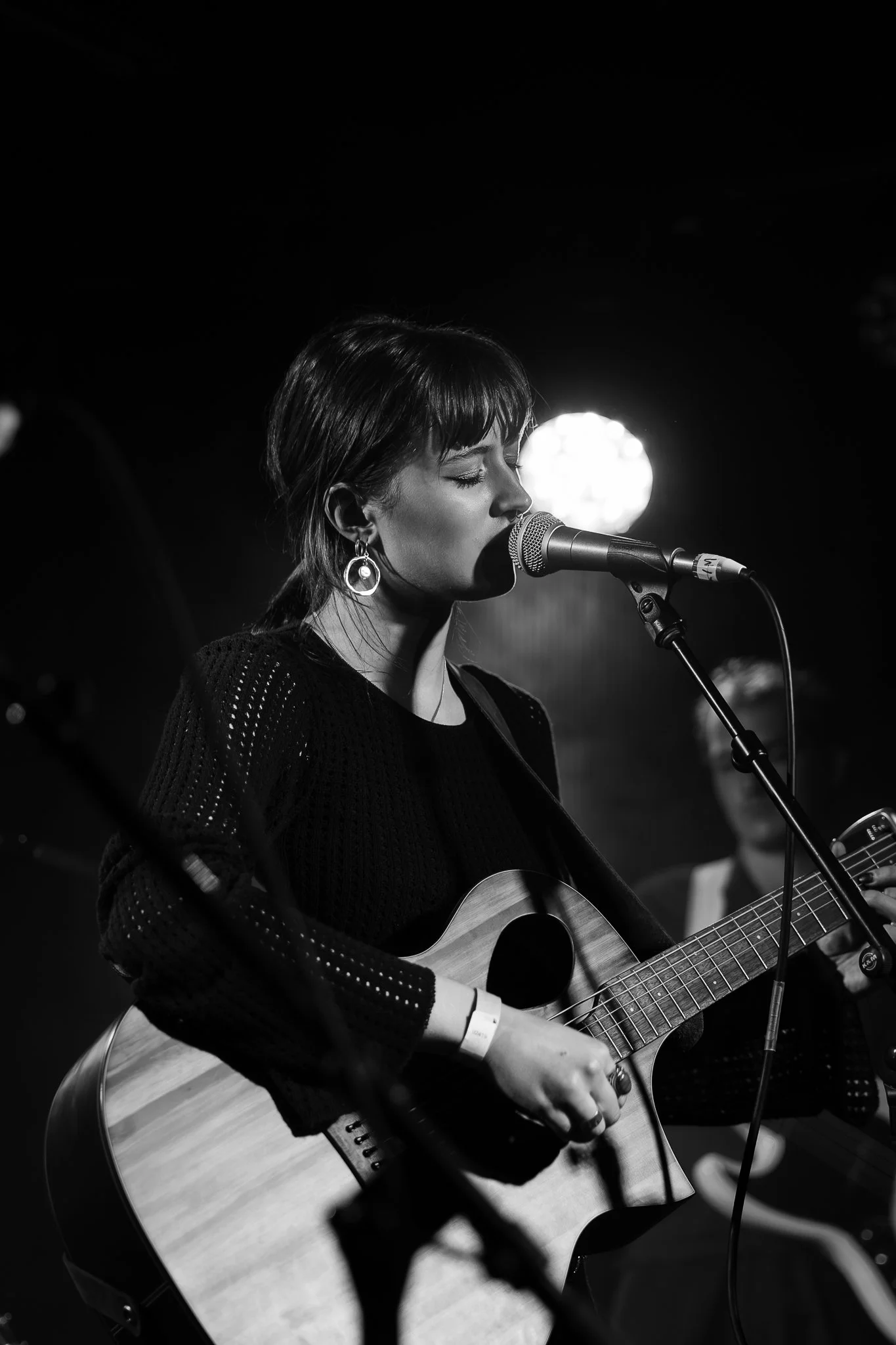 A woman singing into a microphone while playing an acoustic guitar on stage, black and white photo.