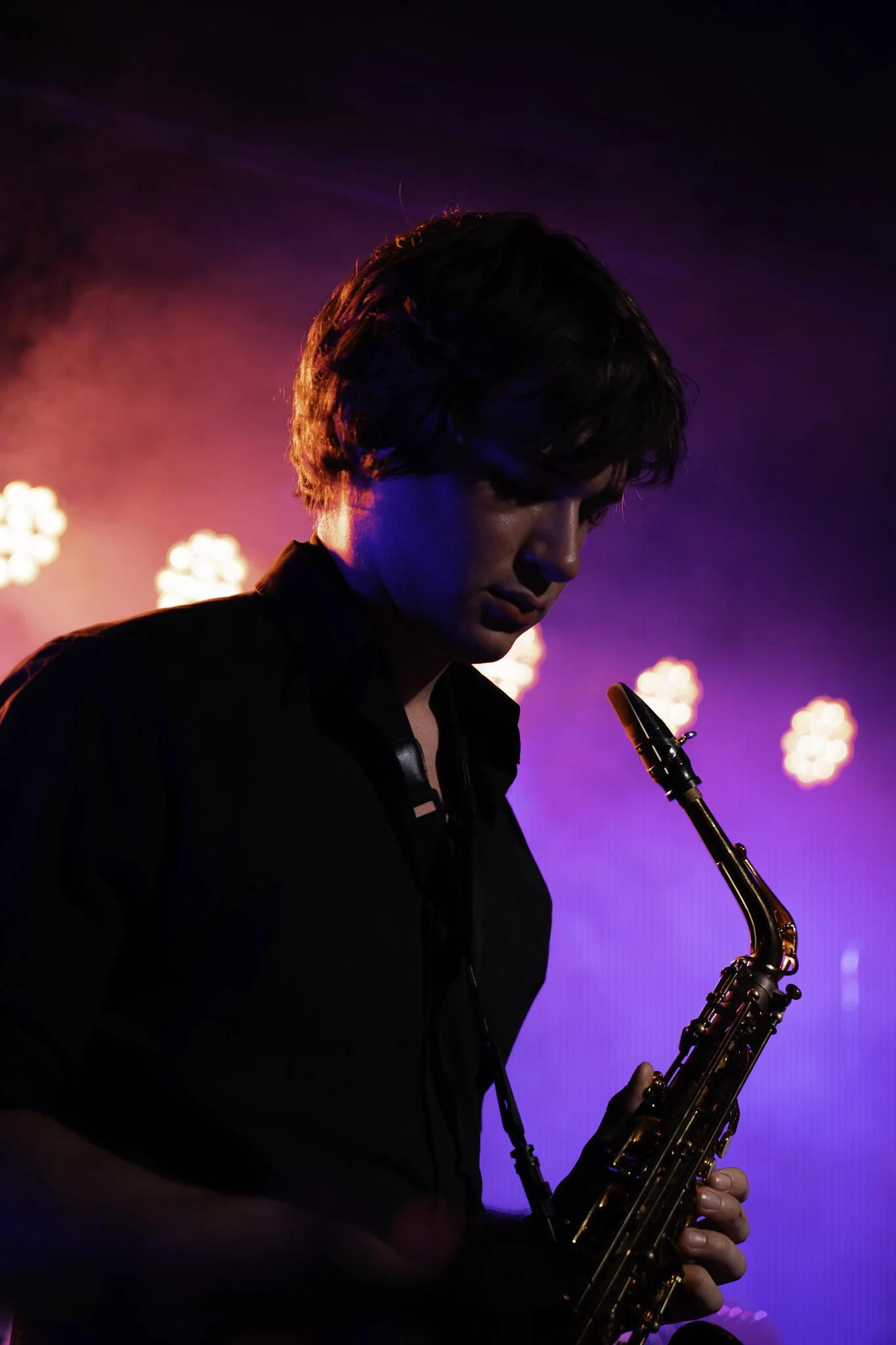 Young man playing saxophone on stage, illuminated by colorful stage lights with pink, purple, and blue hues.