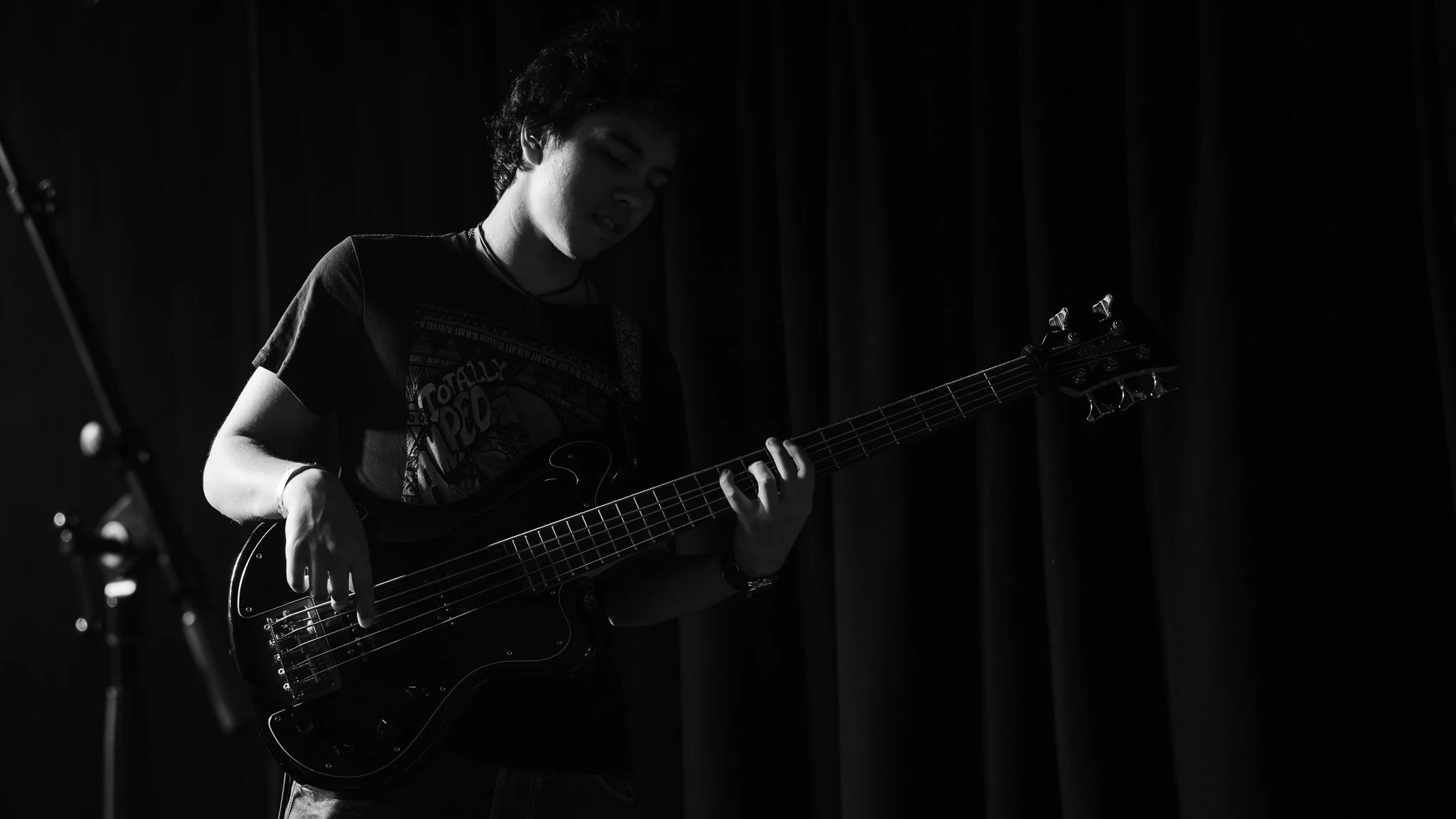 A young person playing an electric bass guitar on stage with dark curtains in the background.