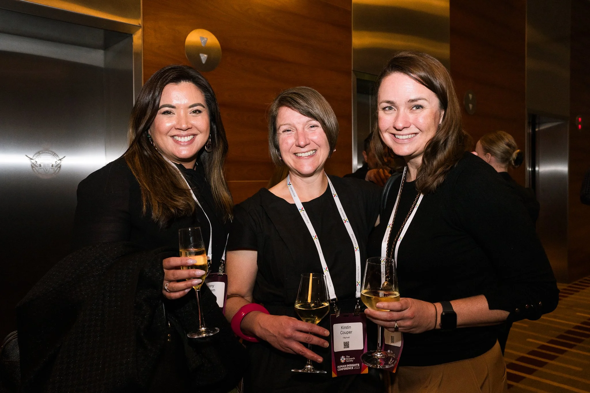 A woman and a man smiling with glasses of red wine at an indoor event, wearing conference lanyards, standing against a wooden wall.