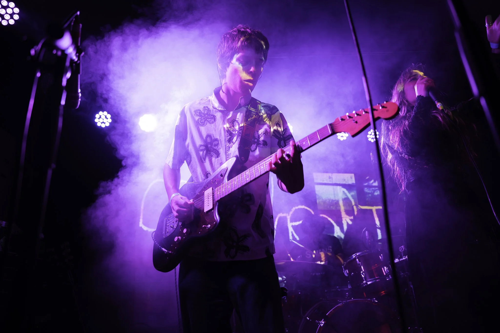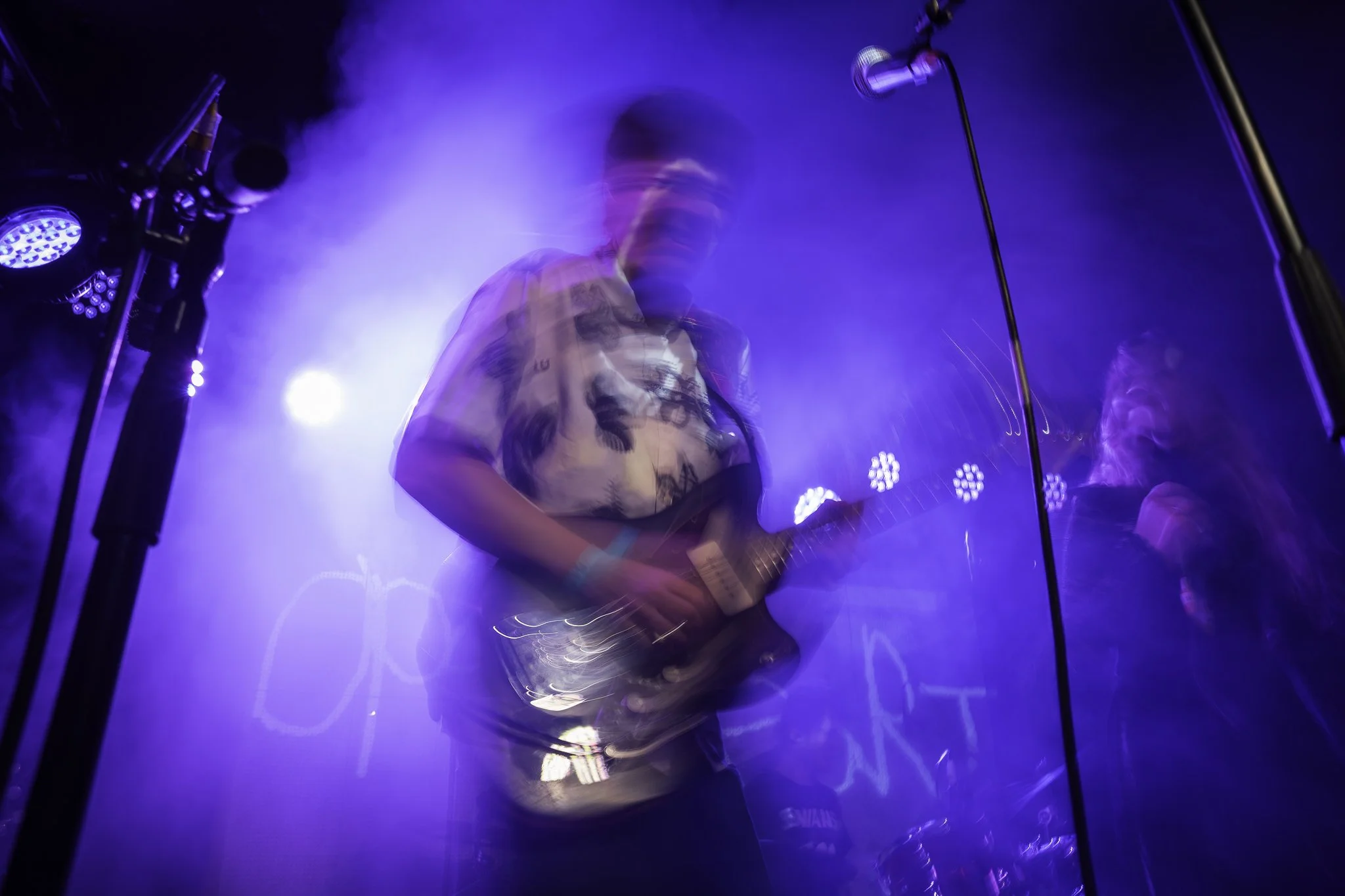 A young man playing an electric guitar on stage with purple and blue stage lighting and fog effects.