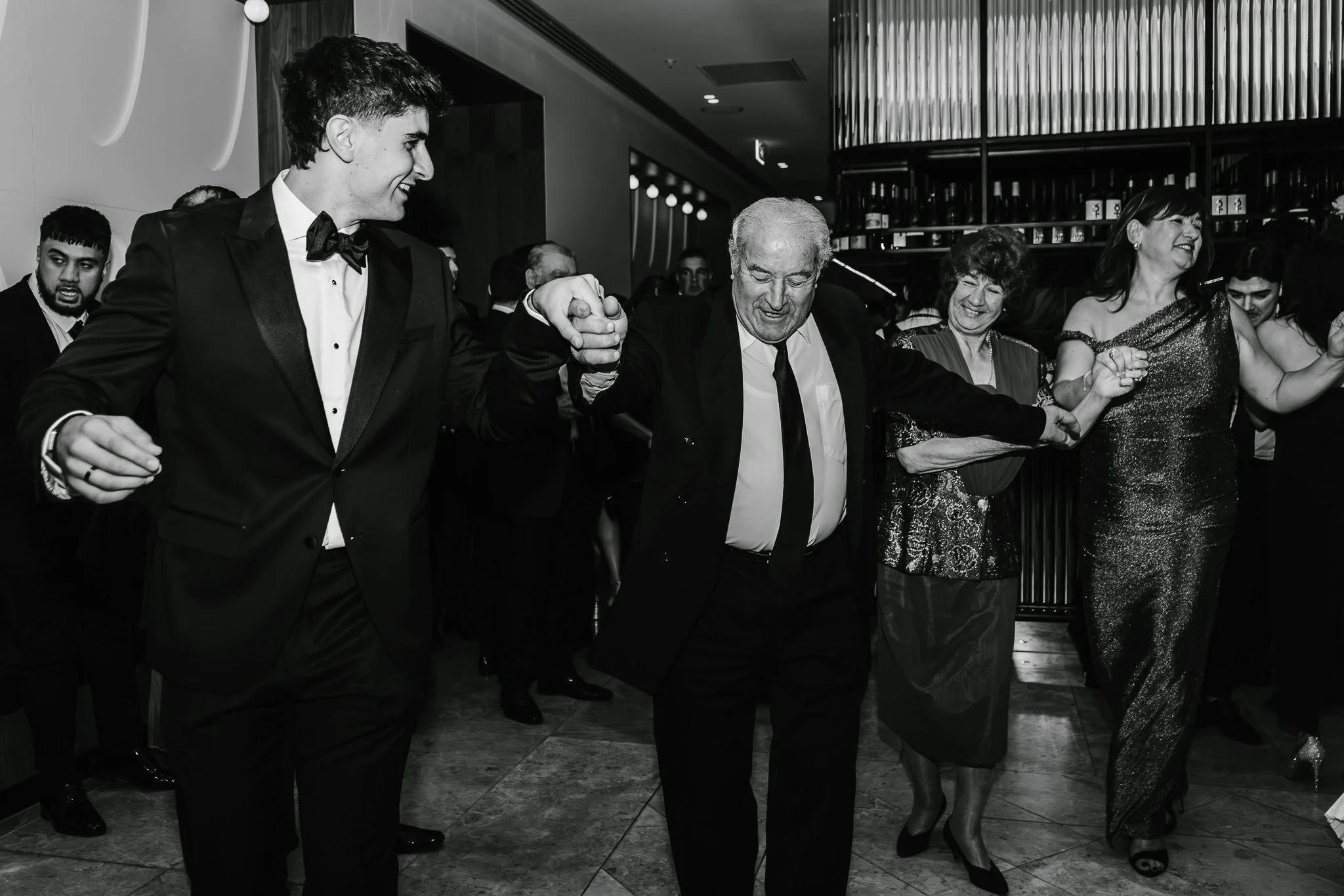People dancing and holding hands, enjoying a celebration or party in formal attire at an indoor event.