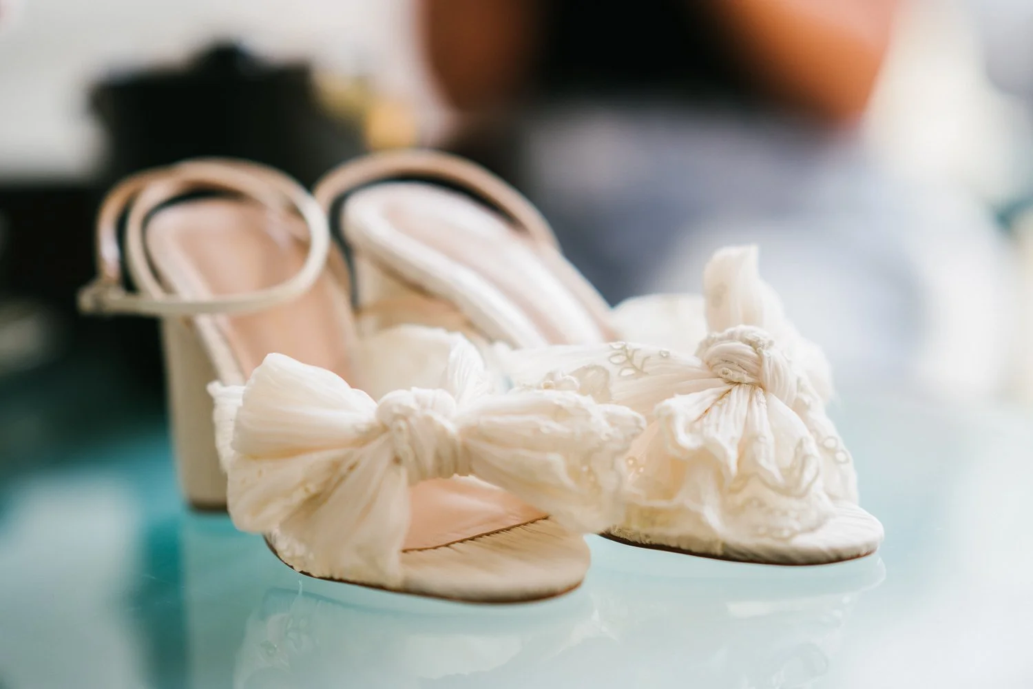 Pair of ivory satin high-heeled shoes with large bow embellishments on the front.