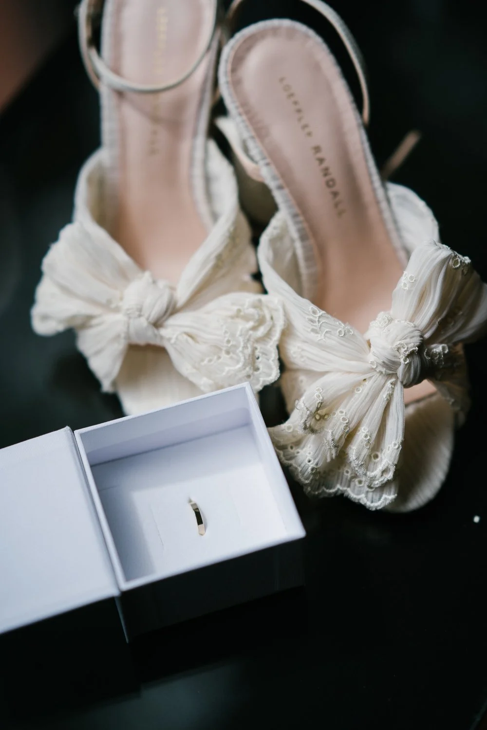 A gold wedding band in an open white box beside a pair of blush pink and white Chanel high heels with satin ribbon bows.