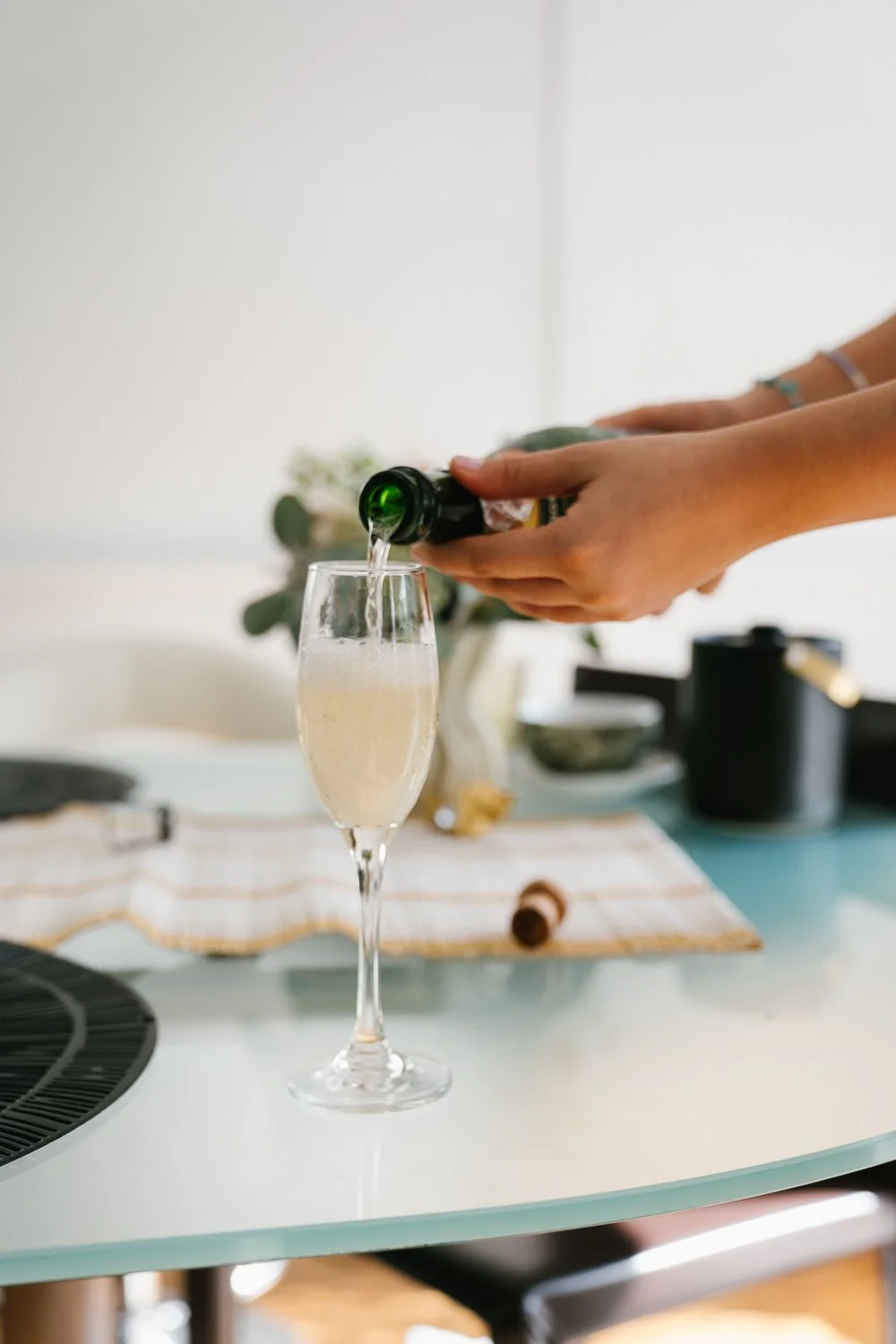 Person pouring champagne into a flute on a dining table with a blurred background.