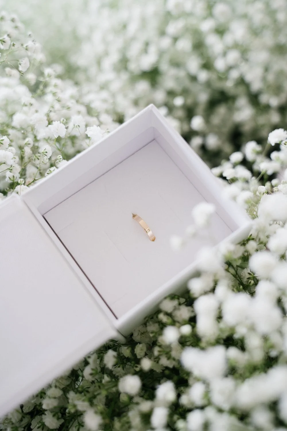 A gold wedding band in a white jewelry box surrounded by white baby's breath flowers.