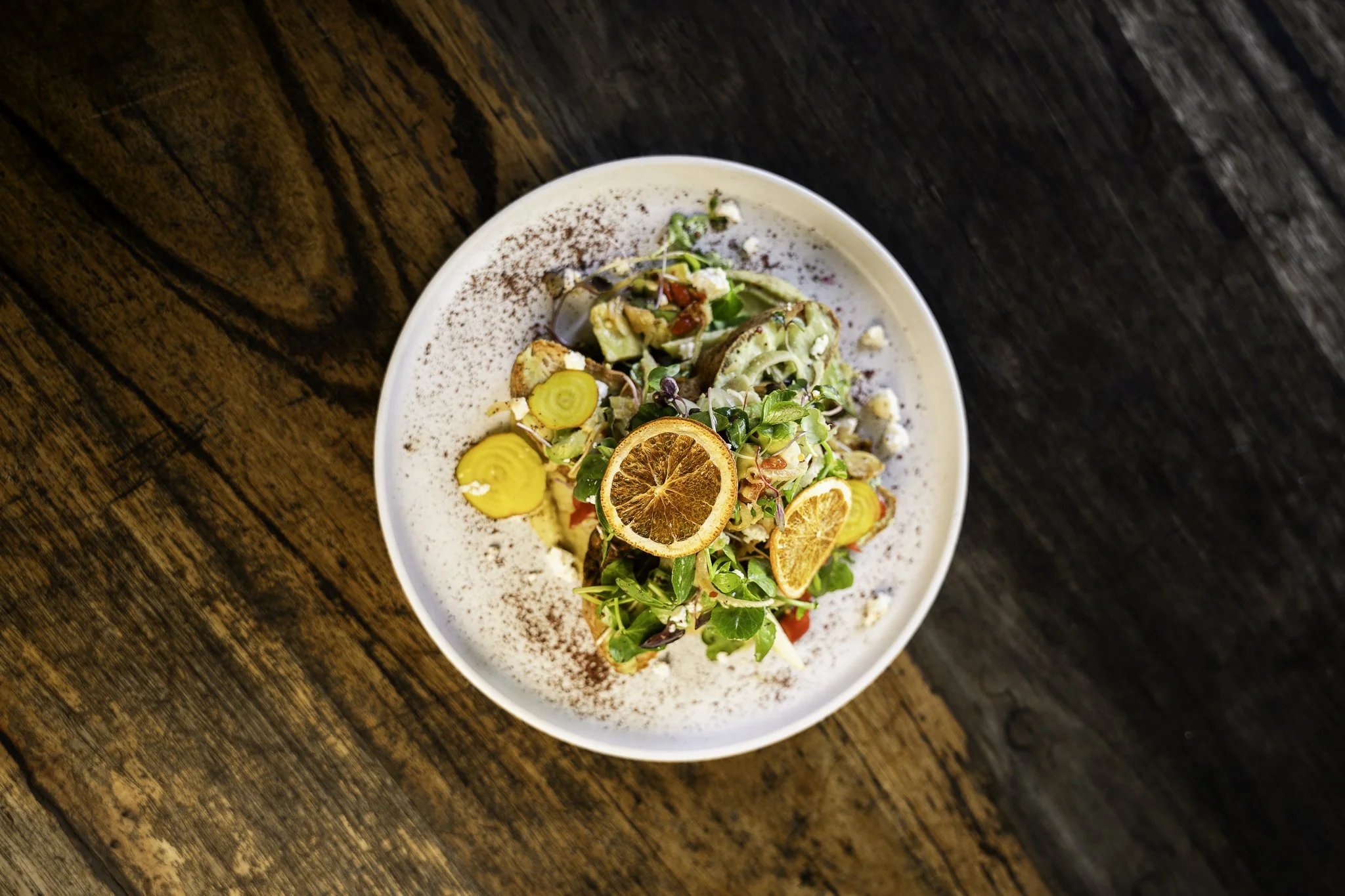 A white plate with a colorful salad topped with dried orange slices, microgreens, and vegetables on a wooden table.