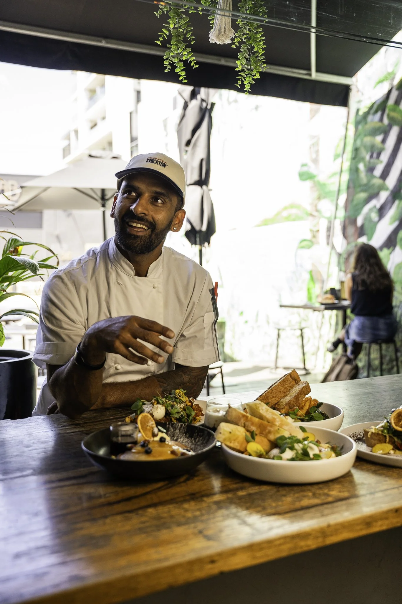 A smiling chef seated at a wooden table with various colorful dishes, in a bright restaurant with outdoor seating and green plants.