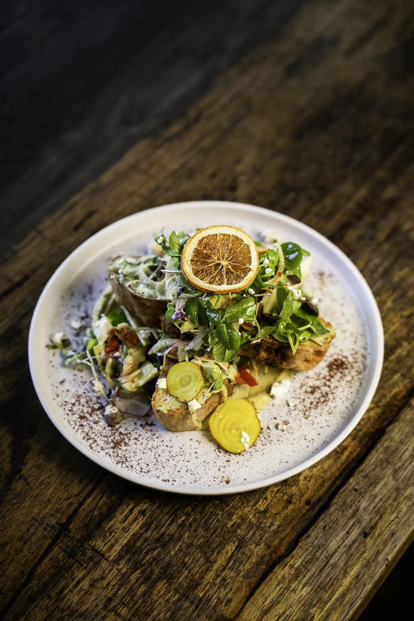 A plate of food with toasted bread topped with a creamy spread, pickles, fresh greens, and garnished with a dried lemon slice and yellow beet slices, with a sprinkling of spice around the edge of the plate.