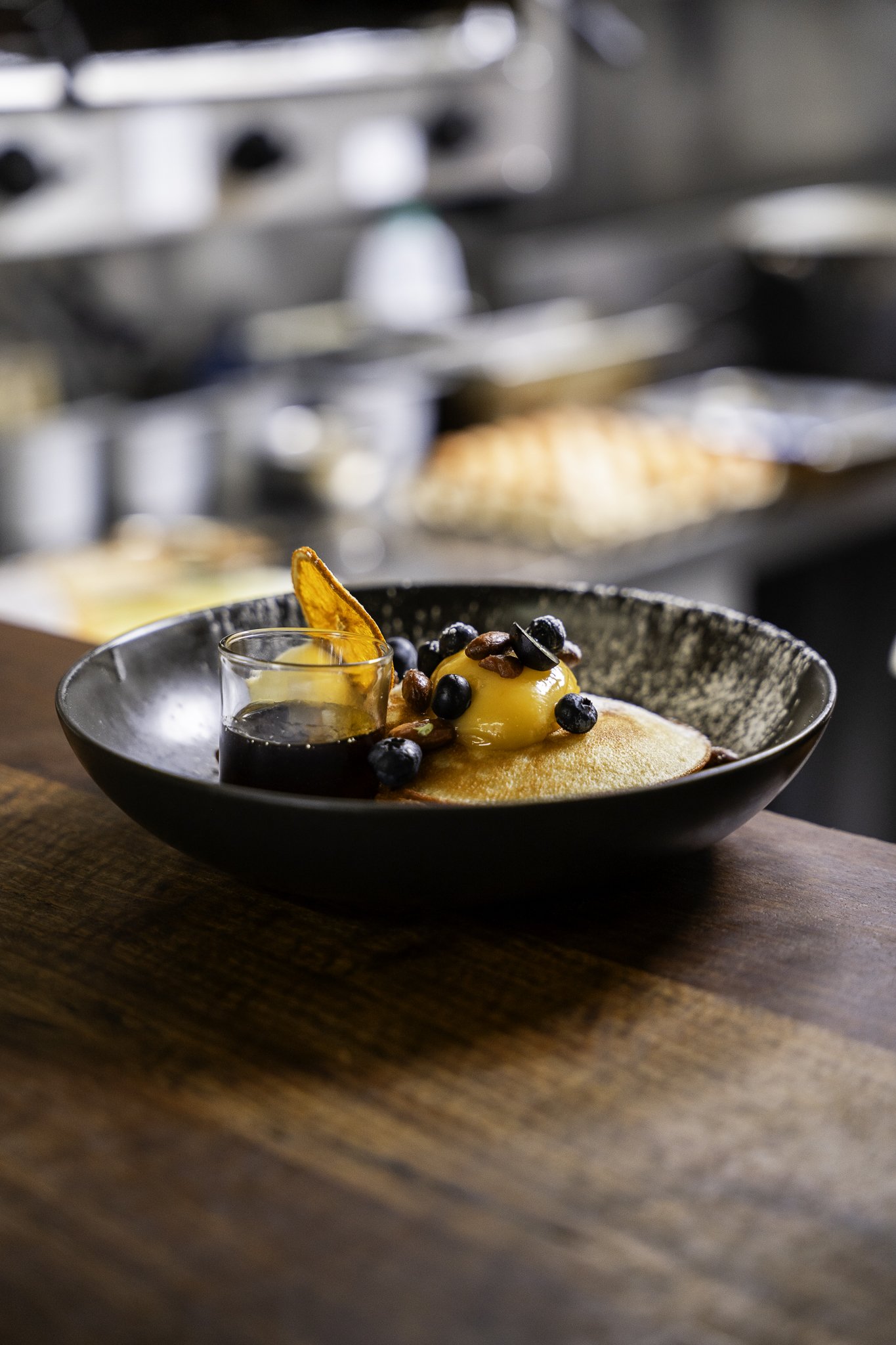 A plated dessert with a small glass of dark sauce, topped with a slice of caramelized fruit, garnished with blueberries, chocolate shavings, and a scoop of yellow-colored ice cream or mousse. The plate is on a wooden surface, with a blurred industria